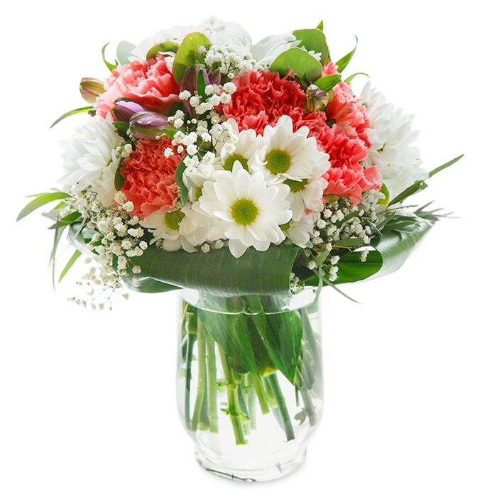 Introduce a touch of refined elegance to any setting with our charming handpicked bouquet. This artful floral display features a cool palette of crisp white chrysanthemums, soft gypsophila, and light pink carnations, all framed by lush aspidistra leaves. Each element is carefully selected to provide unmatched freshness and quality, ensuring a luxurious and inviting atmosphere.